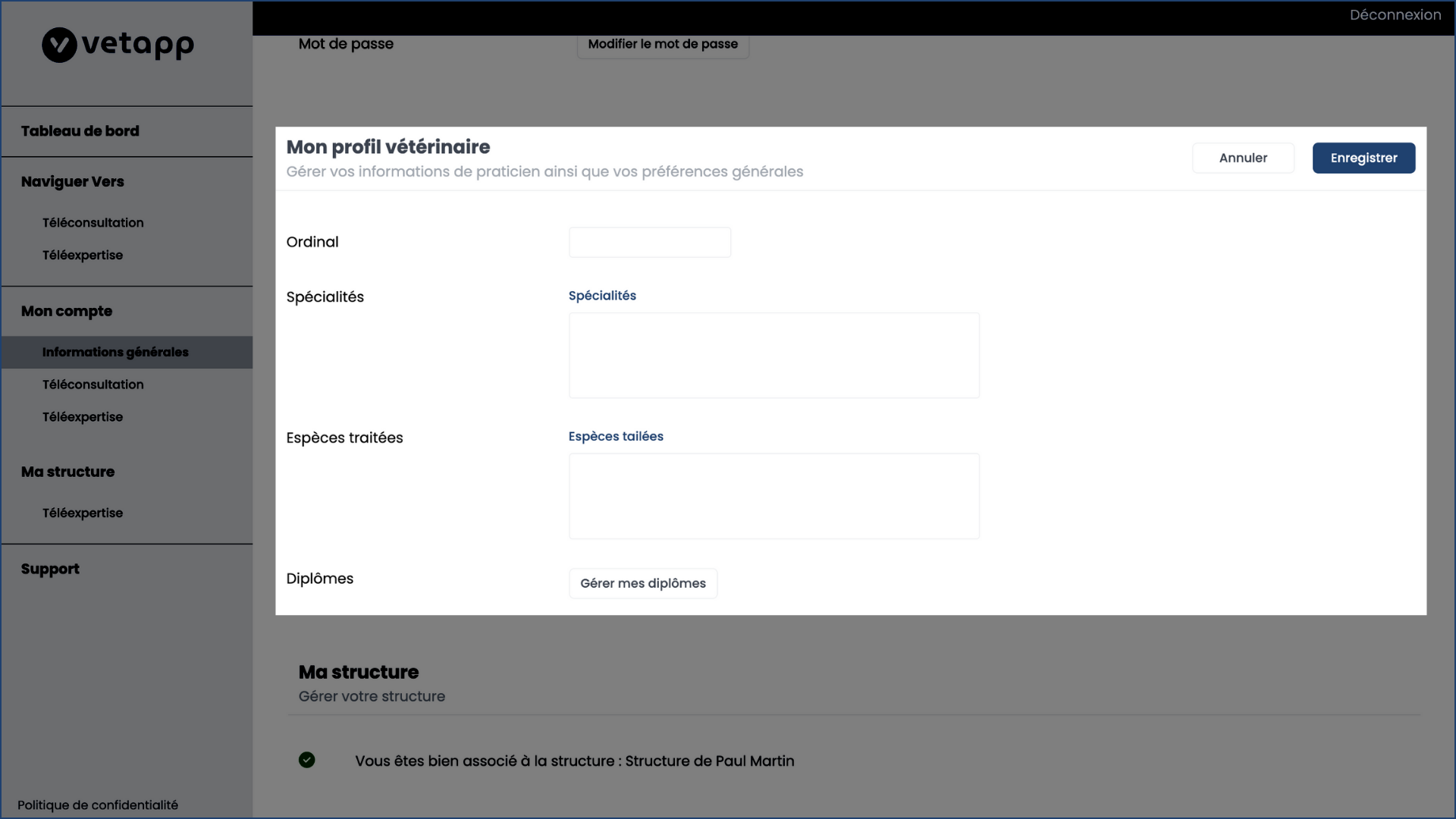 Sur la droite de l'écran, cliquez sur le bouton "Modifier" pour compéter votre profil vétérinaire. Vous pouvez renseigner votre numéro ordinal (si vous en avez un, ce n'est par exemple souvent pas le cas pour les vétérinaires exerçant en école nationale vétérinaire), mais aussi vos spécialités ou disciplines d'exercice, les espèces que vous traiter ainsi que les diplômes correspondant aux compétences que vous afficher.