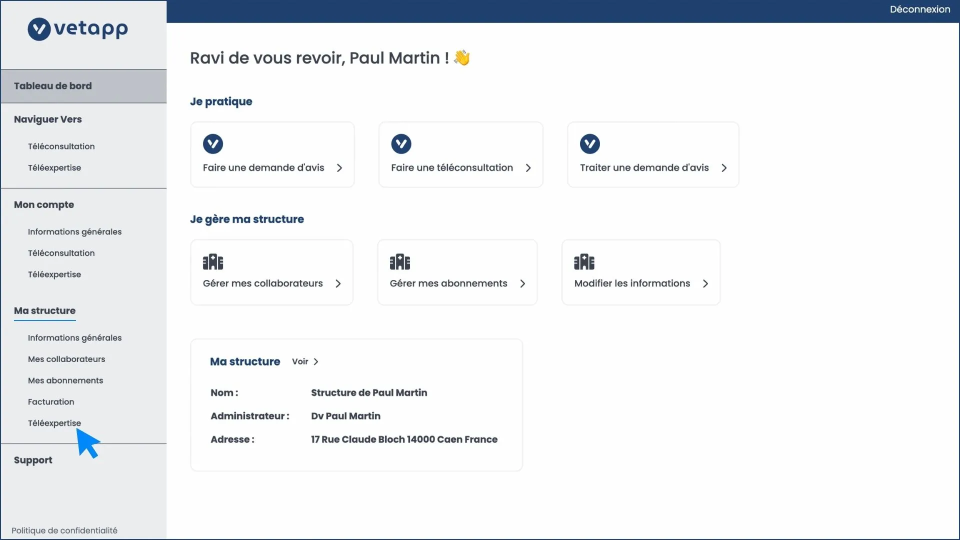 Depuis le menu situé à gauche de votre écran, accédez à l'espace téléexpertise de l'onglet "Ma structure".