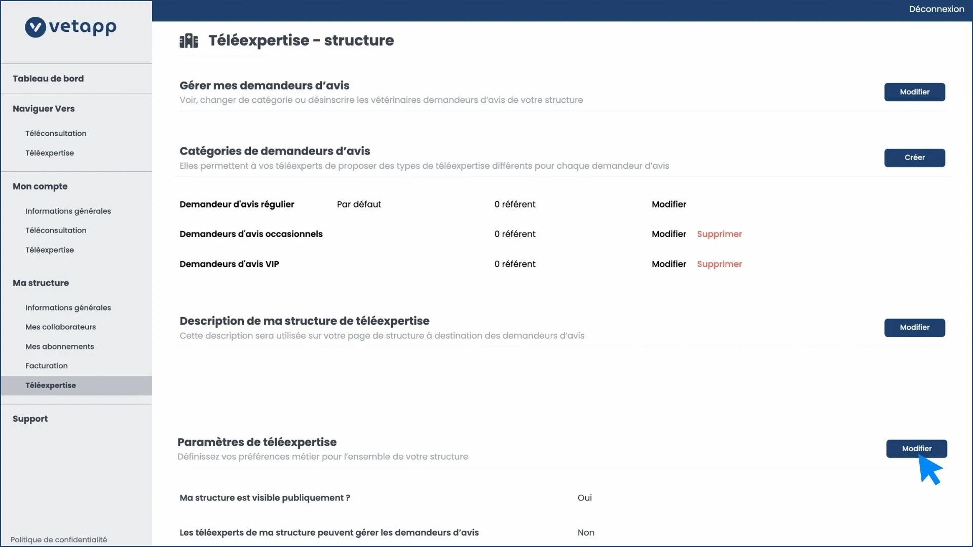 - et également modifier les paramètres de téléexpertise, en cliquant sur le bouton "Modifier" en bas à droite de votre écran.