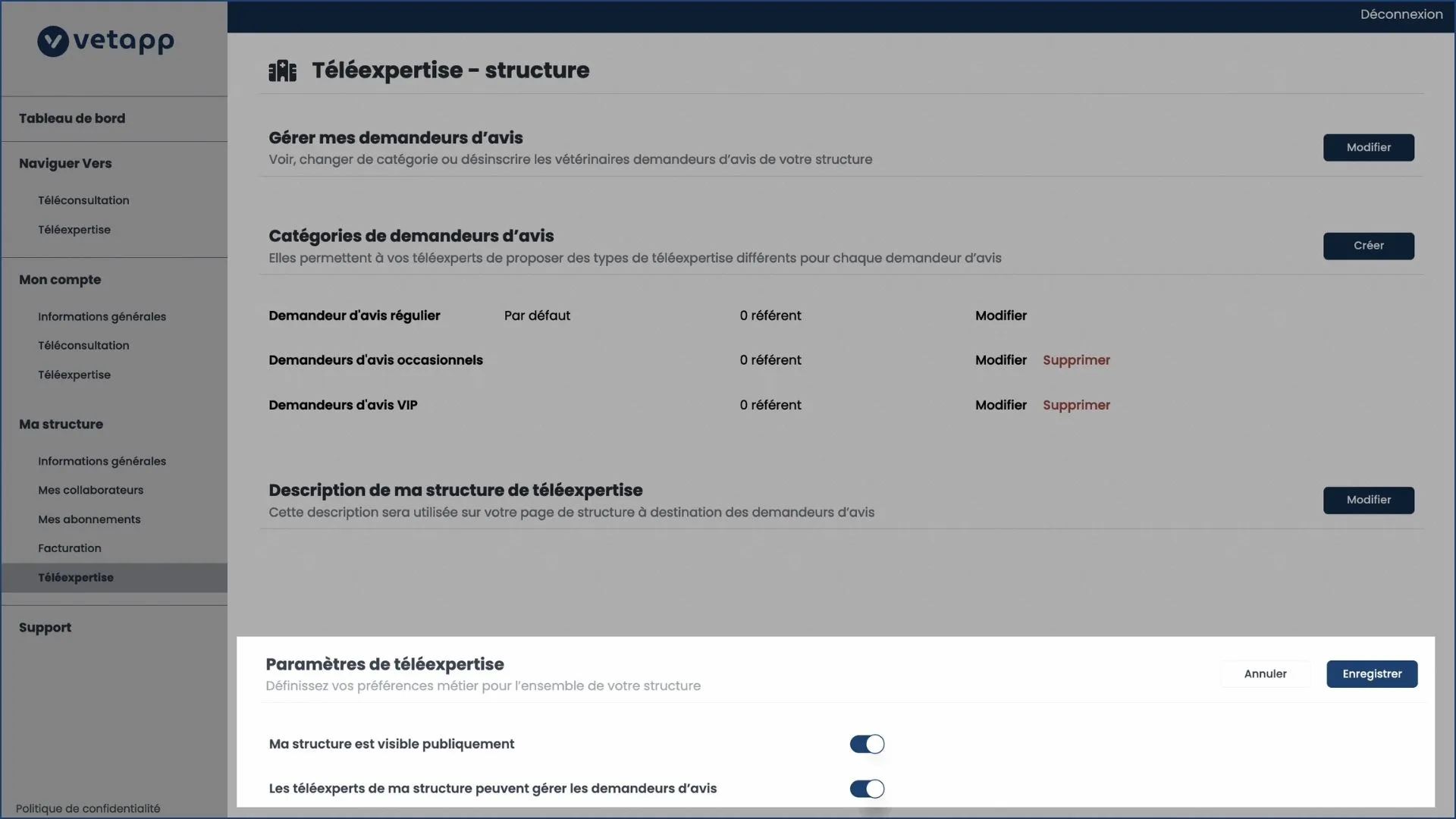 En tant que gérant de votre structure sur notre plateforme de télémédecine, vous pouvez autoriser les vétérinaires téléexperts que vous avez ajouté comme membre à trier leurs demandeurs d'avis. Les demandeurs d'avis sont les vétérinaires qui sollicitent l'expertise en ligne des vétérinaires experts. Ainsi, les téléexperts de votre structure pourront attribuer une catégorie aux différents demandeurs d'avis.